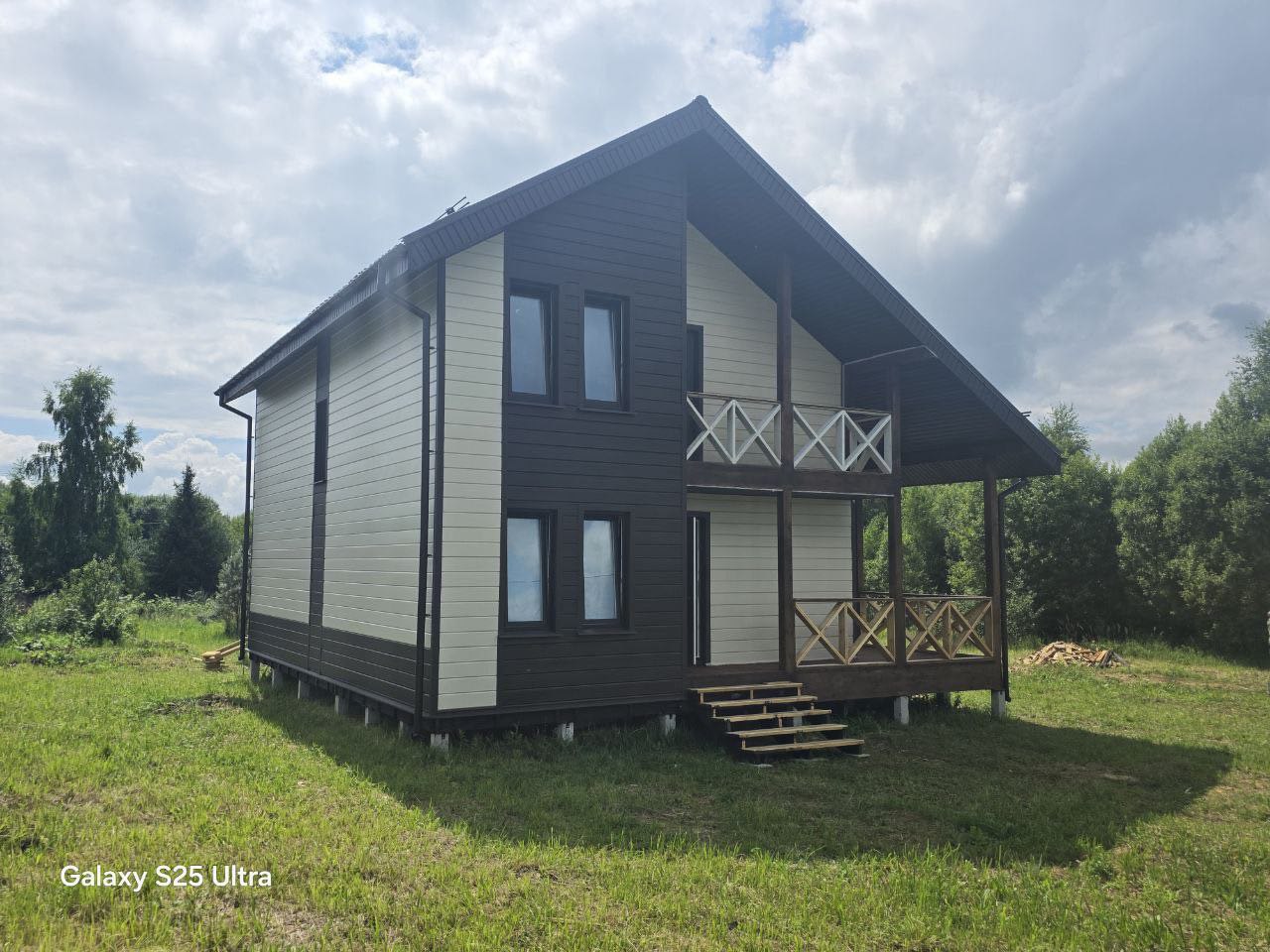 Дом в классическом стиле 140 м2 в д. Обухово, г. Алексин, фасад выполнен из эко бруса, начало строительства 30 апреля, окончание 12 июля.